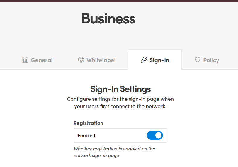 For users to be able to register themselves on the network, the Self-Registration feature must be enabled in the admin dashboard.