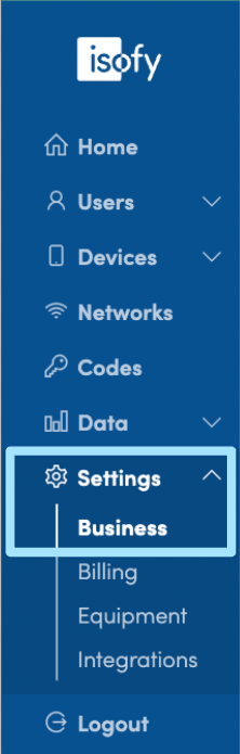 - Next, in the isofy Admin Dashboard's sidebar, choose Settings, then Integrations: