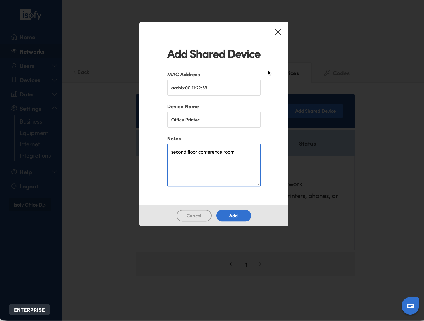 A dialog box will appear where you can add the shared device details. The MAC Address is required.