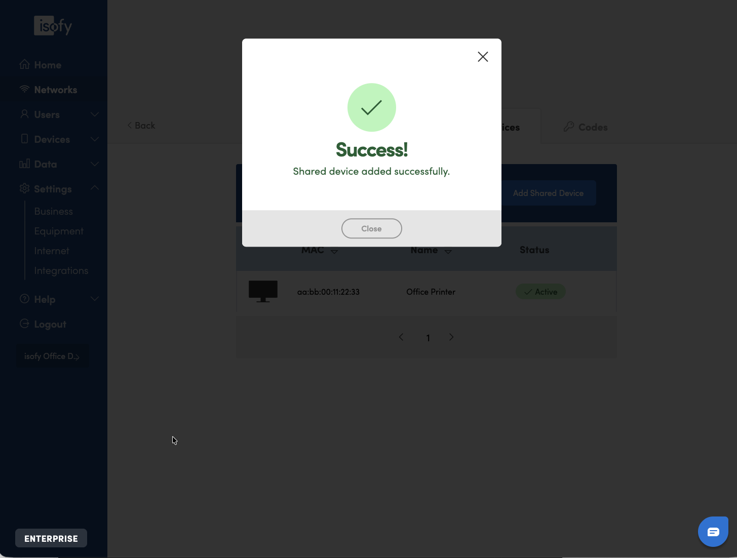 Click on Close and you will be returned to the Shared Devices list. Users on that network will now be able to connect to this device.