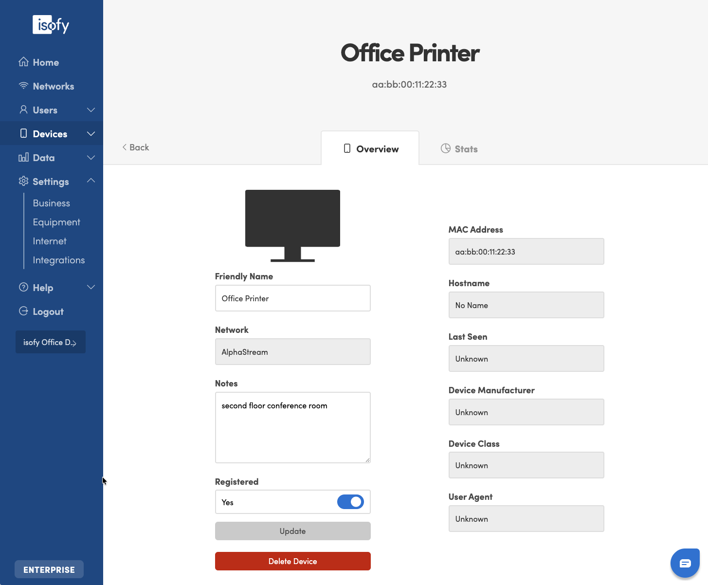 Click on the device in the list to view or update device information, or to delete the device.
